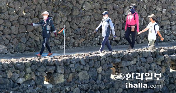 25일 제주시 구좌읍 하도리 별방진내 마을안길 돌담길을 올레꾼들이 여유롭게 걷고 있다. 강희만기자