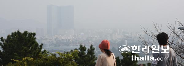 27일 제주시내 전체가 미세먼지 '나쁨' 수준을 보인 가운데, 제주시 도두봉에서 노형동 일대가 뿌옇게 보이고 있다. 이상국기자