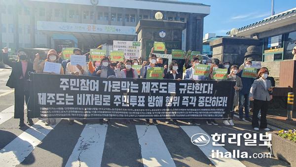 비자림로를 지키기 위해 뭐라도 하려는 시민모임 등 24개 단체가 28일 제주도청 앞에서 기자회견을 열고 구호를 외치고 있다. 사진=강민성기자