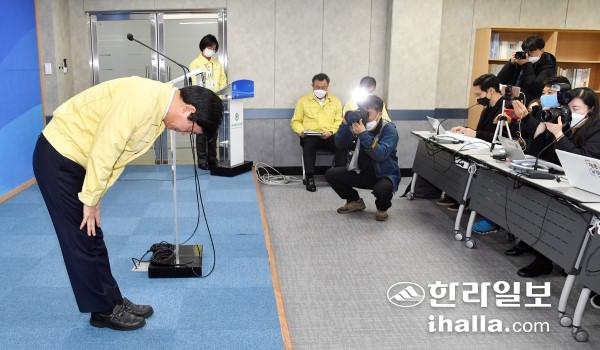 학교 급식소 손가락 절단사고 관련 사과하는 제주자치도교육청 이석문 교육감.