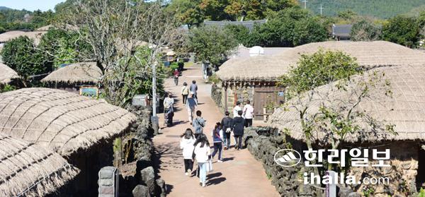 28일 서귀포시 성읍민속마을을 찾은 관광객들이 제주의 전통 초가를 둘러보고 있다. 이상국기자