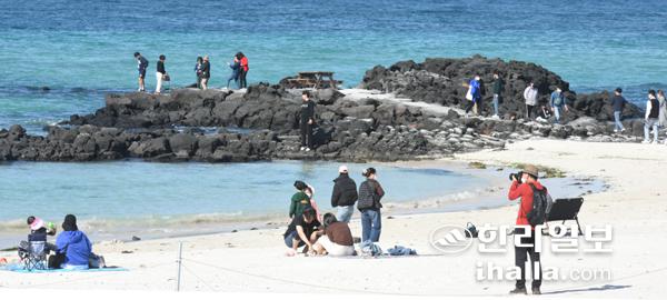 28일 제주시 김녕해수욕장을 찾은 관광객들이 푸른바다를 보며 제주의 가을을 즐기고 있다. 이상국기자