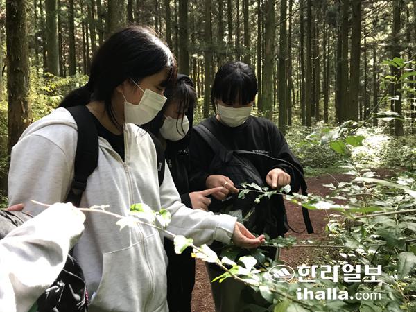 세화중학교 학생들이 숲길을 걸으며 주변 나무를 살펴보고 있다. 김도영기자