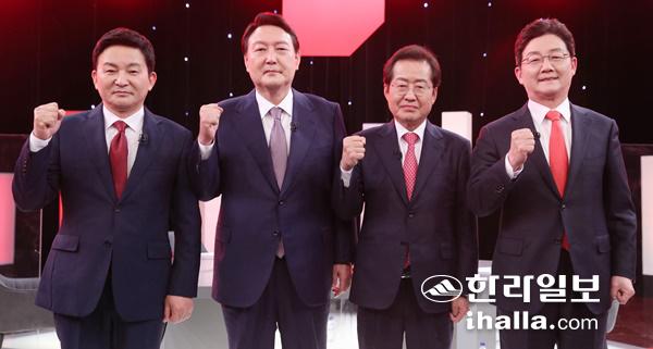 국민의힘 대선 경선 후보자 제10차 합동토론회가 열린 31일 저녁 서울 여의도 KBS 스튜디오에서 원희룡(왼쪽부터), 윤석열, 유승민, 홍준표 대선 경선 후보가 토론 시작에 앞서 포즈를 취하고 있다. 연합뉴스
