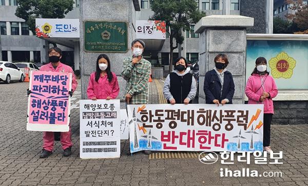 핫핑크돌핀스·제주녹색당·해양동물생태보전연구소가 1일 오전 9시30분 제주도의회 정문 앞에서 기자회견을 열고 도의회는 한동평대 해상풍력사업에 대해 부동의해야 한다고 주장했다. 사진=강민성기자