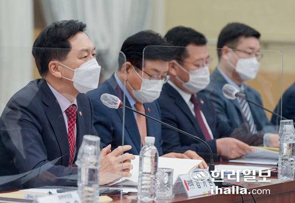 2일 오전 제주도청에서 열린 \'제주도-국민의힘 예산정책협의회\'에서 김기현 국민의힘 원내대표가 인사말을 하고 있다. 연합뉴스