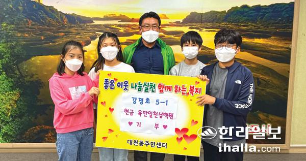 강정초등학교(교장 강미자) 5학년 1반 학생들은 지난달 29일 알뜰장터 수익금 6만1300원을 대천동주민센터에 기부했다. 성금은 학생들이 알뜰장터를 운영해 직접 나눔활동을 통해 마련됐다.