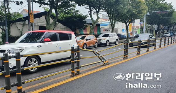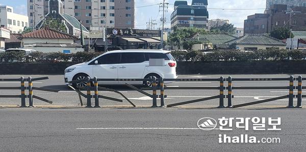 3일 제주시 삼도2동 서사로에 설치된 중앙분리대가 파손돼 있다. 사진=강민성기자