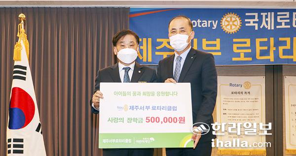 국제로타리 3662지구 제주서부로타리클럽(고영준 회장)은 지난 2일 제주 메종글래드에서 서부로타리클럽 창립 16주년 행사를 진행하며 초록우산 어린이재단 제주지역본부(본부장 김희석)에 장학금 50만원을 후원했다.