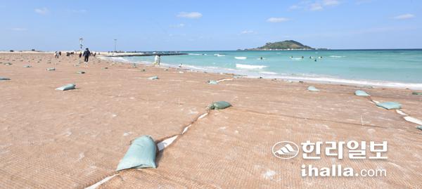 3일 제주시 협재해수욕장에 모래유실을 방지하기 위한 비사방지막이 설치되어 있다. 이상국기자
