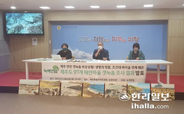 녹색연합이 4일 오전 제주도의회 1층 도민카페에서 기자회견을 열고 제주도 97개 마을 갯녹음 조사 결과를 발표했다. 강민성기자