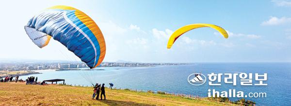 청명한 가을 날씨가 이어진 4일 제주시 함덕 서우봉을 찾은 관광객들이 패러글라이딩을 타고 창공으로 날아 오르고 있다. 이상국기자