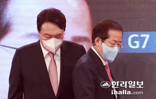 국민의힘 홍준표 대선 경선 후보(오른쪽)와 윤석열 대선 경선 후보가 5일 오후 서울 용산구 백범김구기념관에서 열린 국민의힘 제2차 전당대회에서 단상에 오르고 있다. 연합뉴스