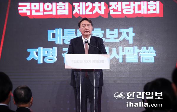 국민의힘 대선 후보로 선출된 윤석열 후보가 5일 오후 서울 용산구 백범김구기념관에서 열린 제2차 전당대회에서 수락연설을 하고 있다. 연합뉴스