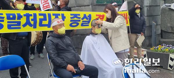 5일 월정리마을회 관계자들이 5일 오전 제주도청 앞에서 머리를 삭발하고 있다.