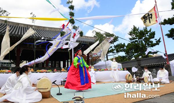 제주민예총이 주최하고 신축항쟁 120주년 기념사업회가 주관한 1901년 신축항쟁 '장두 추모굿'이 7일 제주시 도심 관덕정 마당에서 열려 제주큰굿보존회 서순실 심방의 집전으로 120년 전 신축항쟁으로 희생된 이들을 위무하고 살아남은 자와 살아가야 하는 터전을 함께 치유하는 '상생의 굿'이 펼쳐지고 있다. 강희만기자