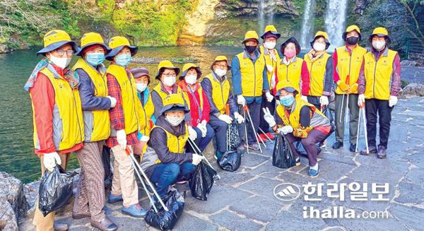 서귀포노인대학 18기 자원봉사클럽(코치 김종길)은 지난 5일 오전 7시부터 9시까지 서귀포 천지연폭포 및 주차장 일대에서 클럽회원 담배꽁초 등 각종 쓰레기를 수거하며 환경정화 봉사활동을 전개했다.