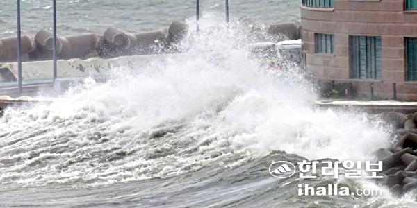 강한 바람이 불며 가을비가 내린 8일 제주시 탑동 방파제에 집채만한 파도가 밀려오고 있다. 강희만기자