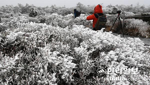 9일 눈이 내린 한라산 영실 탐방로를 찾은 등반객들이 겨울 정취를 만끽하고 있다. 강희만기자