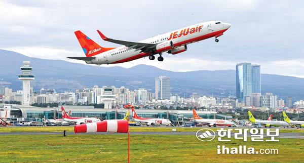 9일 제주 전역에 강한 바람이 불며 초겨울 날씨를 보인 가운데 제주국제공항 남북활주로에서 항공기가 이륙하고 있다. 남북활주로 개방은 좀처럼 보기 드문 일이며, 강한 바람이 부는 악조건에도 소형항공기는 이착륙이 가능하다. 강희만기자