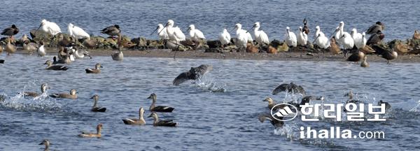 겨울을 나기위해 제주를 찾은 저어새(천연기념물 제205-1, 멸종위기종 1급)들이 10일 하도철새도래지에서 강한 바람을 피해 휴식을 하고 있다. 강희만기자