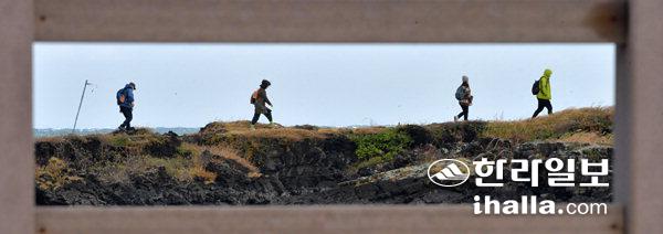 10일 제주시 구좌읍 행원리 해안 올레길을 찾은 올레꾼들이 초겨울 강한 바람을 맞으며 걸어가고 있다. 강희만기자