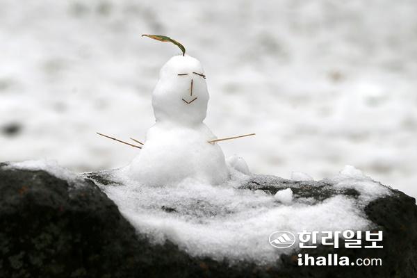 10일 오전 눈이 내려 쌓인 제주 한라산 1100고지에 앙증맞은 눈사람이 관광객들의 눈길을 끌고 있다. 연합뉴스