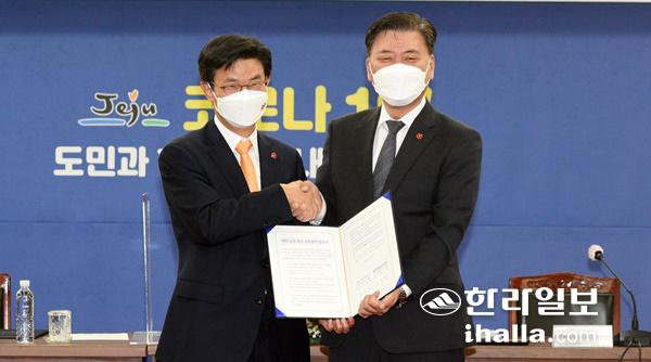 이석문 제주자치도교육감과 구만섭 제주자치도지사 권한대행이 11일 제주교육발전을 위한 공동협력 합의서를 채택한 후 악수를 교환하고 있다. 이상국 기자