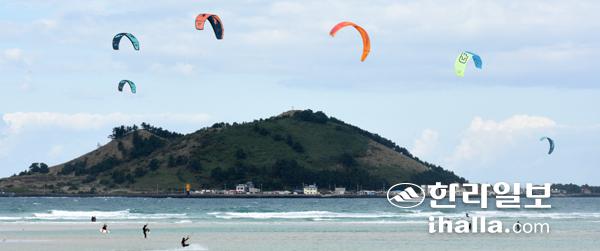 11일 제주시 한림읍 금능해수욕장을 찾은 서퍼들이 강한 바람을 이용해 카이트서핑을 즐기고 있다. 카이트서핑은 패러글라이딩과 서핑을 조합해 파도가 없어도 서핑을 즐길 수 있도록 고안된 레저스포츠다. 이상국기자