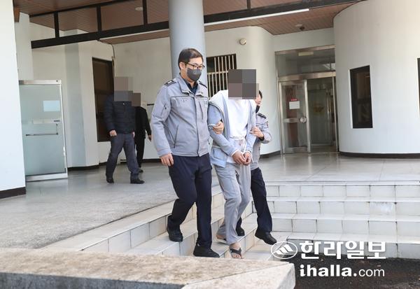 12일 오후 살해 혐의로 구속된 A씨가 제주동부경찰서 유치장을 빠져 나오고 있다.