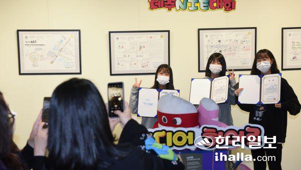 '제13회 JDC와 함께 생각을 춤추게 하는 NIE 전시회' 개막식이 열린 가운데 수상자들이 기념촬영을 하고 있다. 이상국기자
