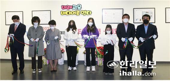 13일 한라일보 1층 갤러리ED에서 개막한 '제13회 JDC와 함께 생각을 춤추게 하는 NIE 전시회' 참석자들이 테이프커팅을 하고 있다. 사진 왼쪽부터 김장영 교육의원, 박진희 제주NIE학회장, 박희순 제주도교육청 정책기획실장, 제주NIE대회 중등부 대상 부서현(신성여중 1), NIE공모전 대상 오수빈(노형중 3), 제주NIE대회 초등부 대상 김라우(한라초 5), 강승수 JDC 경영기획본부장, 김건일 한라일보 대표이사. 이상국기자