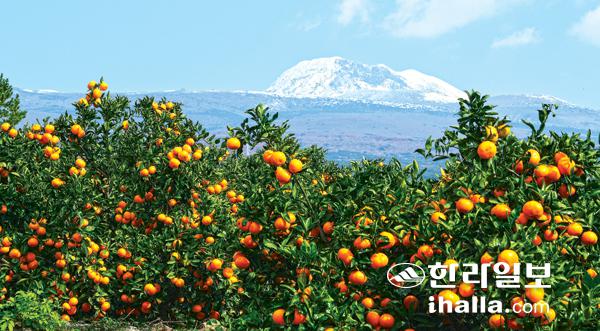 13일 서귀포시 하원동 한 감귤원에서 바라본 한라산이 만설을 이뤄 장관을 연출하고 있다. 강희만기자