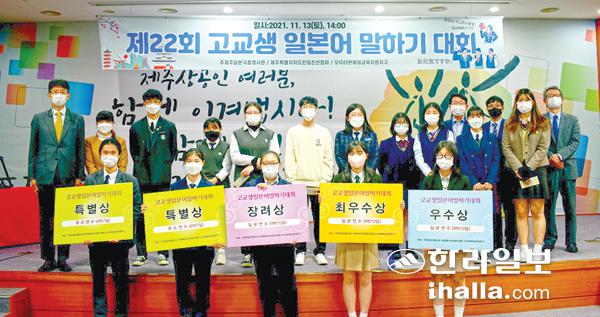 주제주일본국총영사관은 제주특별자치도한일친선협회, 오이타현 해외교육지원기구와 공동으로 지난 13일 제주상공회의소 국제회의장에서 제22회 고교생 일본어 말하기 대회를 개최했다. 1차 예선을 통과한 15명이 참가해 실력을 겨룬 이번 대회에서는 ▷최우수상=황유경(제주외국어고) ▷우수상=현수아(제주외국어고) ▷장려상=김서현(중앙여고) ▷특별상=양서진(중앙여고) 성승남(한림공고) 학생이 수상했다.