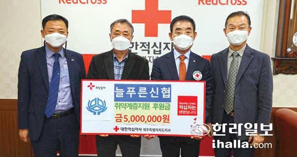 늘푸른신협(이사장 고동환)은 지난 12일 대한적십자사제주특별자치도지사(회장 오홍식)를 방문해 취약계층 지원을 위한 후원금 500만원을 전달했다.