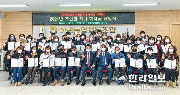 하귀농협(조합장 강병진)은 지난 12일 농협 복지센터 회의실에서 '2021년 조합원 자녀 학자금 전달식'을 갖고 조합원 자녀 40명에게 100만원씩 총 4000만원의 학자금을 전달했다.