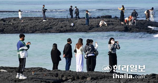 15일 제주시 한림읍 협재해수욕장을 찾은 관광객들이 제주의 가을바다를 즐기고 있다. 강희만기자