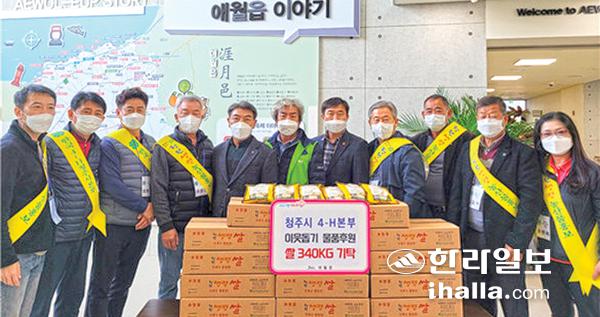 한국 4-H 청주시본부(회장 신권호)는 지난 17일 어려운 이웃에게 전달해달라며 쌀 340㎏을 제주시 애월읍사무소에 기탁했다. 이날 기탁된 쌀은 애월읍 관내 사회복지시설 12개소에 전달할 예정이다.