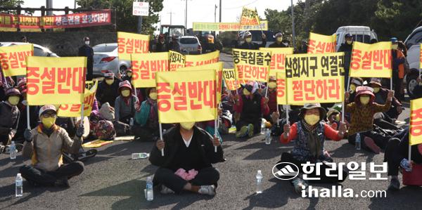 제주시 구좌읍 월정리 주민들이 18일 오전 동부하수처리장 증설 공사를 반대하는 현수막을 내걸고, 진입로 길목을 트랙터와 차량 등으로 막아서며 반발하고 있다. 지난 2017년 말 주민 반발로 무산된 이후 중단돼 왔던 동부하수처리장 증설 공사는 이날부터 재개될 예정이었으나 행정과 주민간 의견차가 좁혀지지 않으면서 갈등을 빚고 있다. 이상국기자