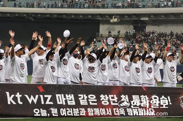 18일 서울 구로구 고척스카이돔에서 열린 2021신한은행 SOL KBO 포스트시즌 한국시리즈 4차전 kt 대 두산의 경기. 창단 첫 통합우승을 달성한 kt 선수들이 팬들에게 인사하고 있다. 연합뉴스