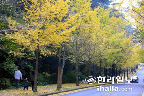 21일 제주시 아라동 제주대 교수아파트 입구 은행나무길에서 나들이객들이 산책을 즐기고 있다. 연합뉴스