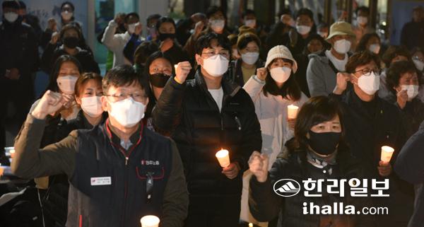 현장 실습을 하다 사고로 목숨을 잃은 고 이민호군의 4주기 추모 촛불집회가 19일 제주시청 앞에서 진행됐다. 이상국기자