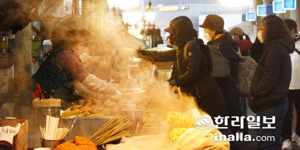 22일 제주시 민속오일시장을 찾은 시민들이 쌀쌀한 날씨에 찰옥수수와 어묵을 먹으며 추위를 녹이고 있다. 이상국기자