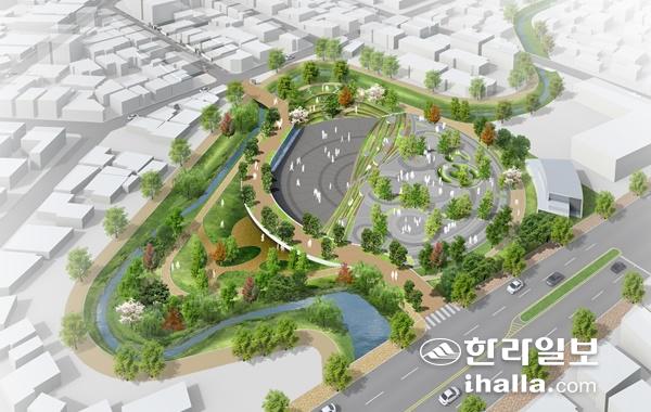 서귀포시 원도심을 문화벨트의 중심축으로 구축하기 위해 추진되고 있는 문화광장 조성사업. 시는 당초 문화광장 내에 저류지 조성을 계획했으나 용역과정에서 장소 변경 의견이 제시됨에 따라 신중하게 검토하고 있다.