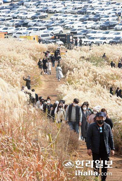 어느새 겨울의 초입이다. 은빛 자랑하던 억새들도 어느새 하얀옷으로 갈아 입고 마지막 자태를 뽐낸다. 24일 제주시 애월읍 새별오름을 찾은 관광객들이 억새들 사이로 산행을 즐기고 있다. 이상국기자
