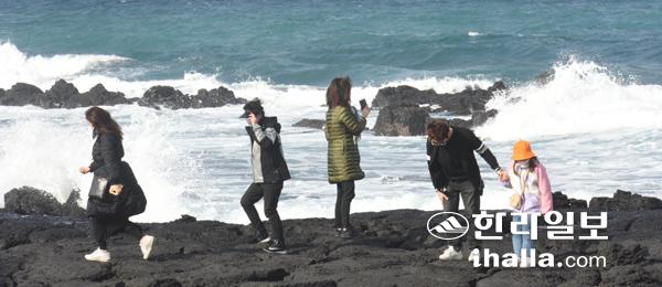 24일 제주시 한림읍 갯바위를 찾은 관광객들이 파도가 몰아치는 바다를 보며 제주자연을 즐기고 있다. 이상국기자
