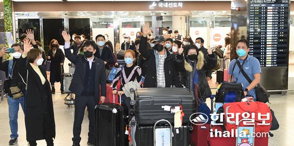 25일 오전 제주국제공항을 통해 싱가포르 단체 관광객이 입도하고 있다. 이상국기자