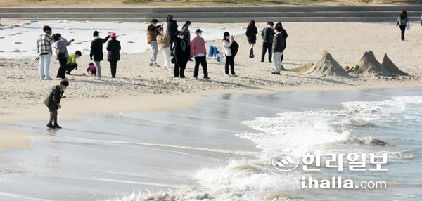 25일 제주시 함덕해수욕장을 찾은 관광객들이 해변을 거닐며 여유로운 시간을 보내고 있다. 이상국기자