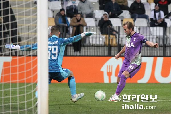 26일 슬로베니아 마리보르의 스타디온 류드스키 브르트에서 열린 2021-2022 콘퍼런스리그 조별리그 G조 5차전 무라와의 경기에서 케인이 동점 골을 성공시키고 있다. 연합뉴스