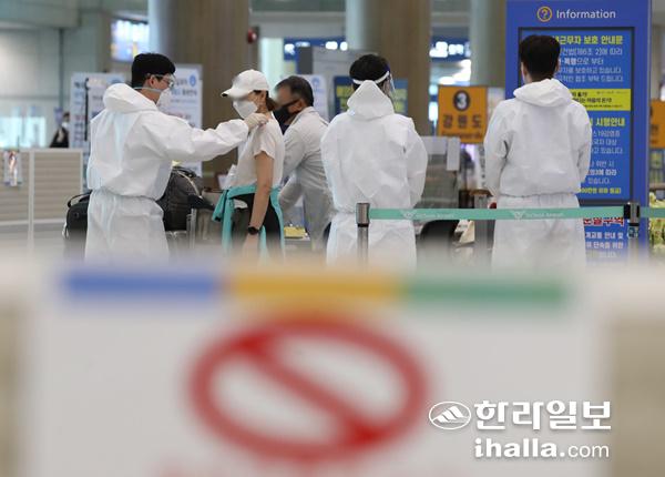 인천공항에서 방역관계자 안내받는 해외입국자들. 연합뉴스
